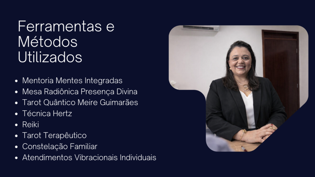 Criadora do Tarô Quântico Mêire Güimarãês e canalizadora da Mesa Radiônica Presença Divina, desenvolveu métodos próprios que unem ciência vibracional, espiritualidade aplicada e sensibilidade terapêutica, conduzindo mulheres a processos profundos de cura emocional, liberação de padrões limitantes e expansão da consciência.